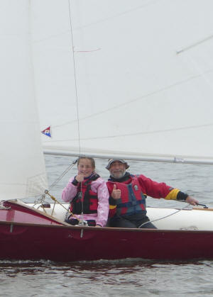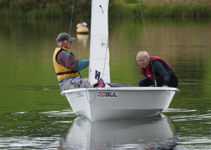 of her new Laser, with Nicky Buckett in the Bosun and Allan Comber in