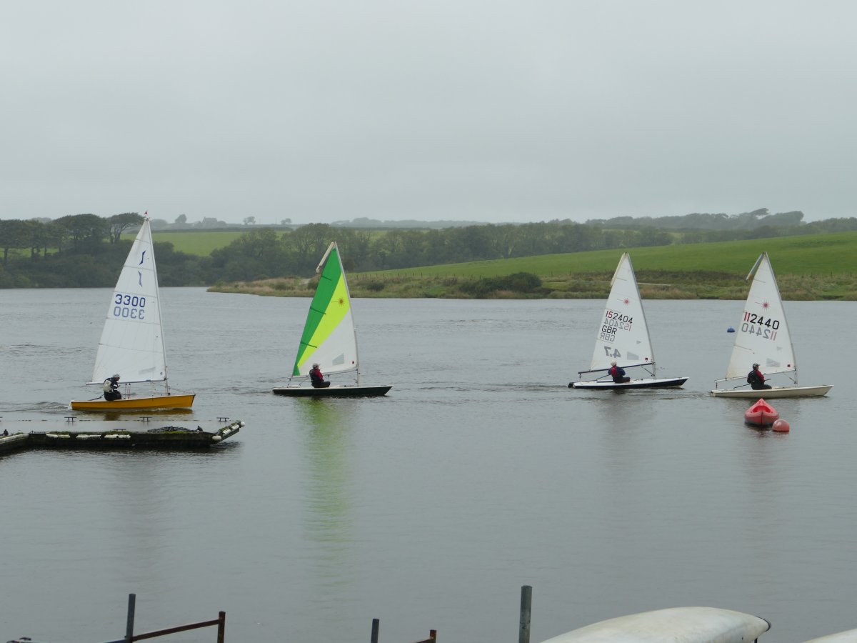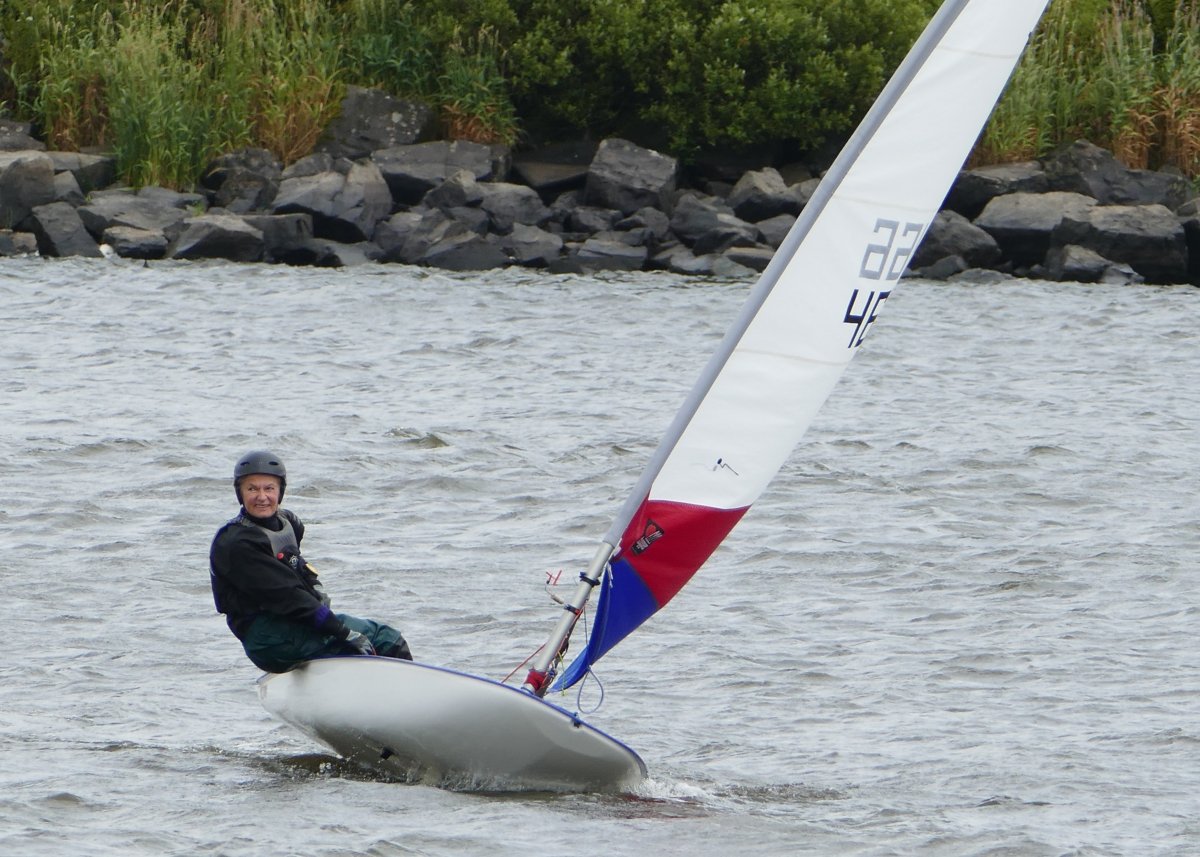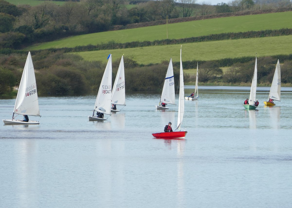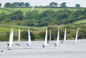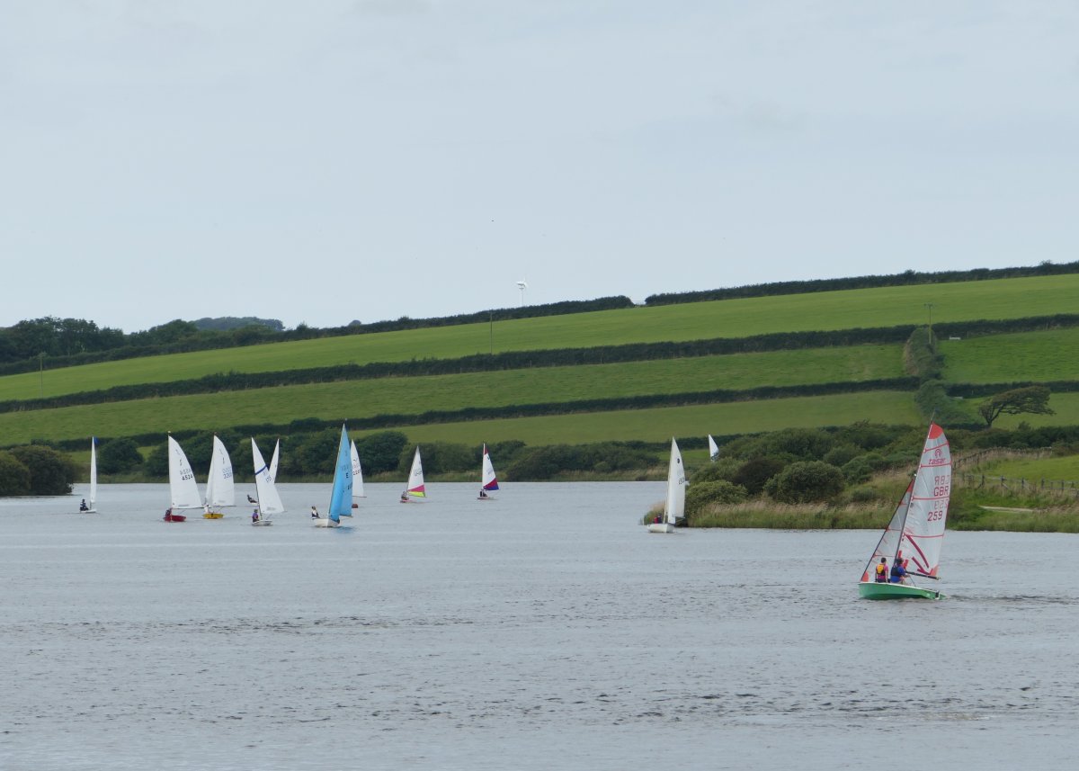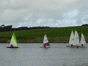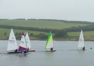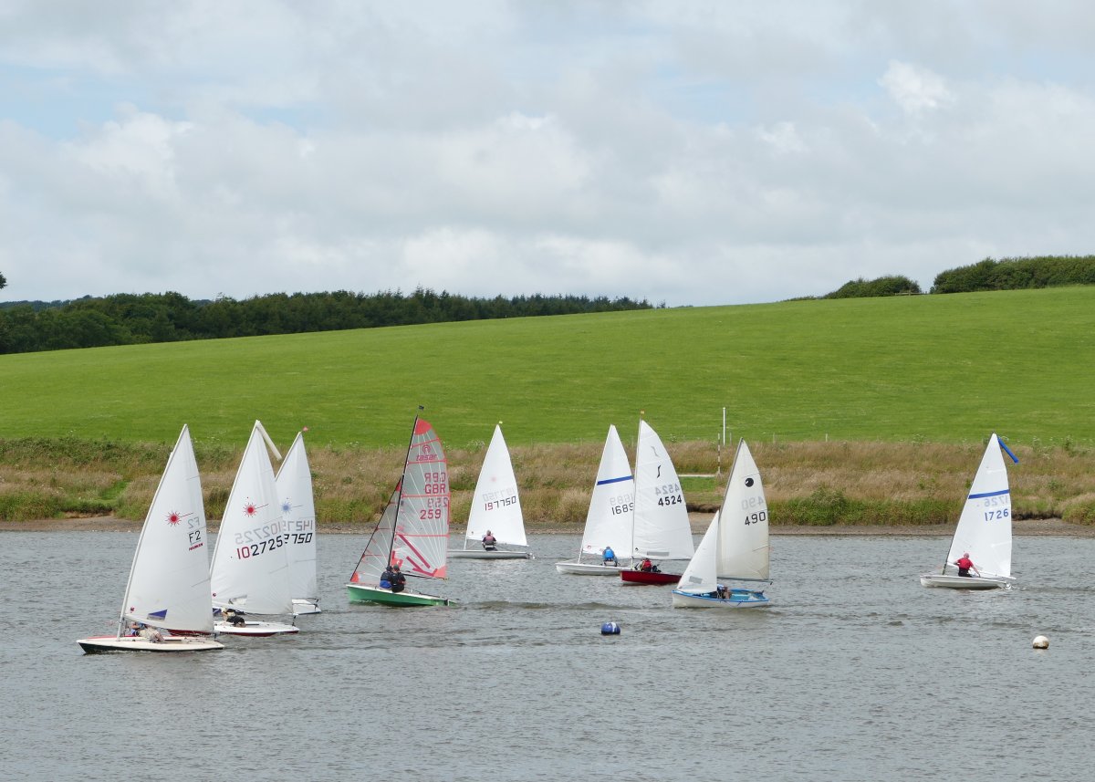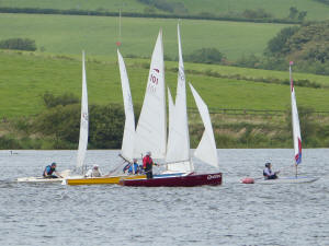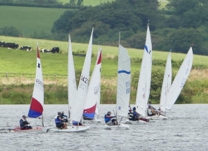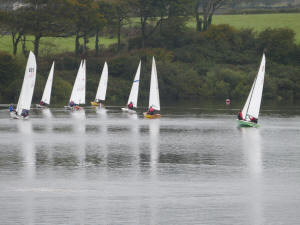 of bigger-sailed dinghies cluster astern of Jane Anderson''s Topper -