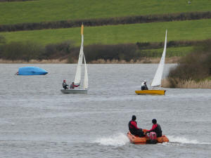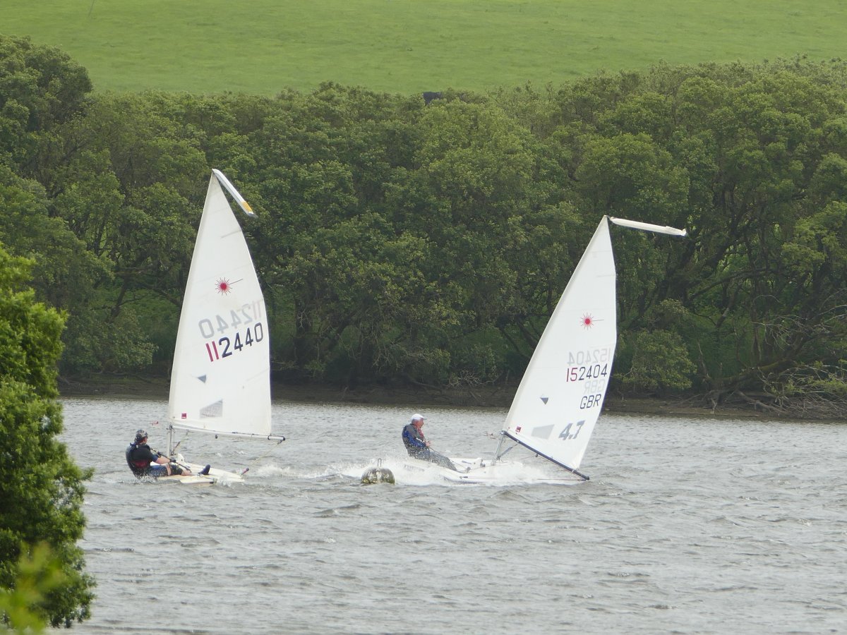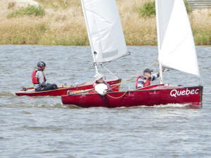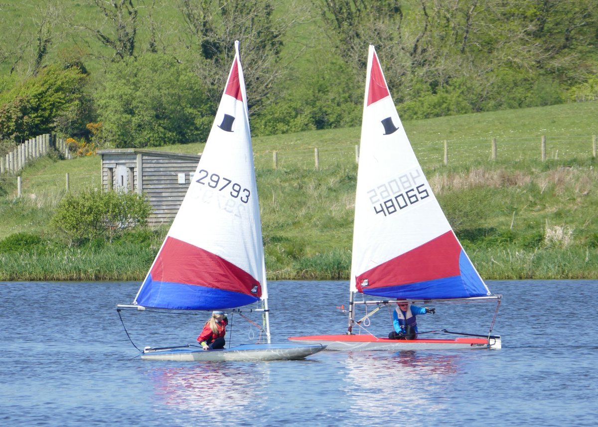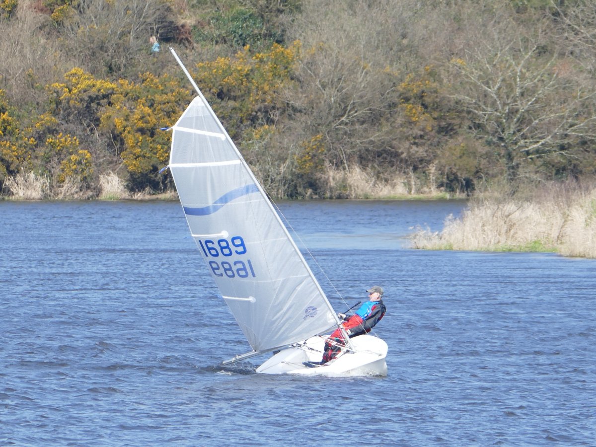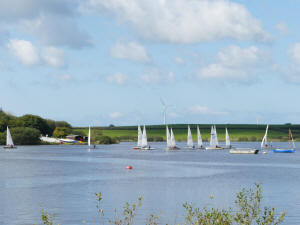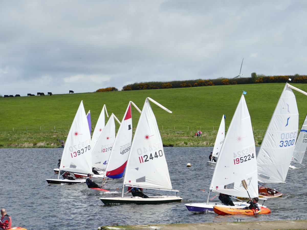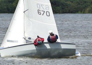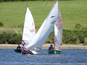 of bigger-sailed dinghies cluster astern of Jane Anderson''s Topper -