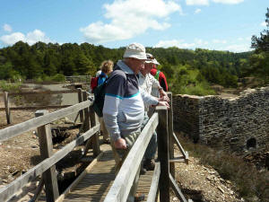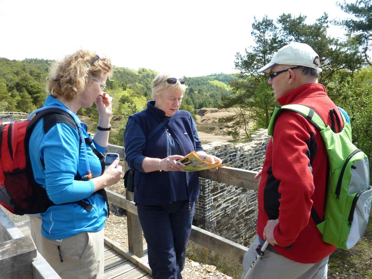 This walk was something rather different: although we're Upper Tamar Sailing Club, this Tamar Valley walk was much further downstream, starting near Gunnislake. The route was along well-signposted gravelled tracks (recently opened thanks to National Lottery, EU and council funding), up-and-down through woodland along the side of the valley, past relics of the days long ago when the area was a hive of mining activity: copper, tin, tungsten and even arsenic. Next to the car park where we assembled was a cafe, owned by the Tree Surfers company that runs high-wire tracks through the woodland tree-tops and this proved to be an excellent spot for coffee and a cake in the bright sunshine as we waited for everybody to arrive. Setting off, we passed several of the Tree Surfers courses, with platforms and slides high up in the canopy, fascinating some of our party and terrifying others. Thereafter, the pleasant woodland scenery was interrupted from time to time by stark reminders of the industrial past: chimneys, leats, lakes and mine buildings. Particularly memorable were the arsenic workings at Wheal Anna Maria: from the path huge heaps of arsenic tailings could be seen, still bare of any vegetation after more than a century - a scary indication of how toxic they must be: the walks booklet explained how in the 1870s, the local mines produced more than half the world's arsenic.