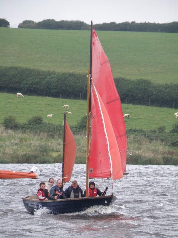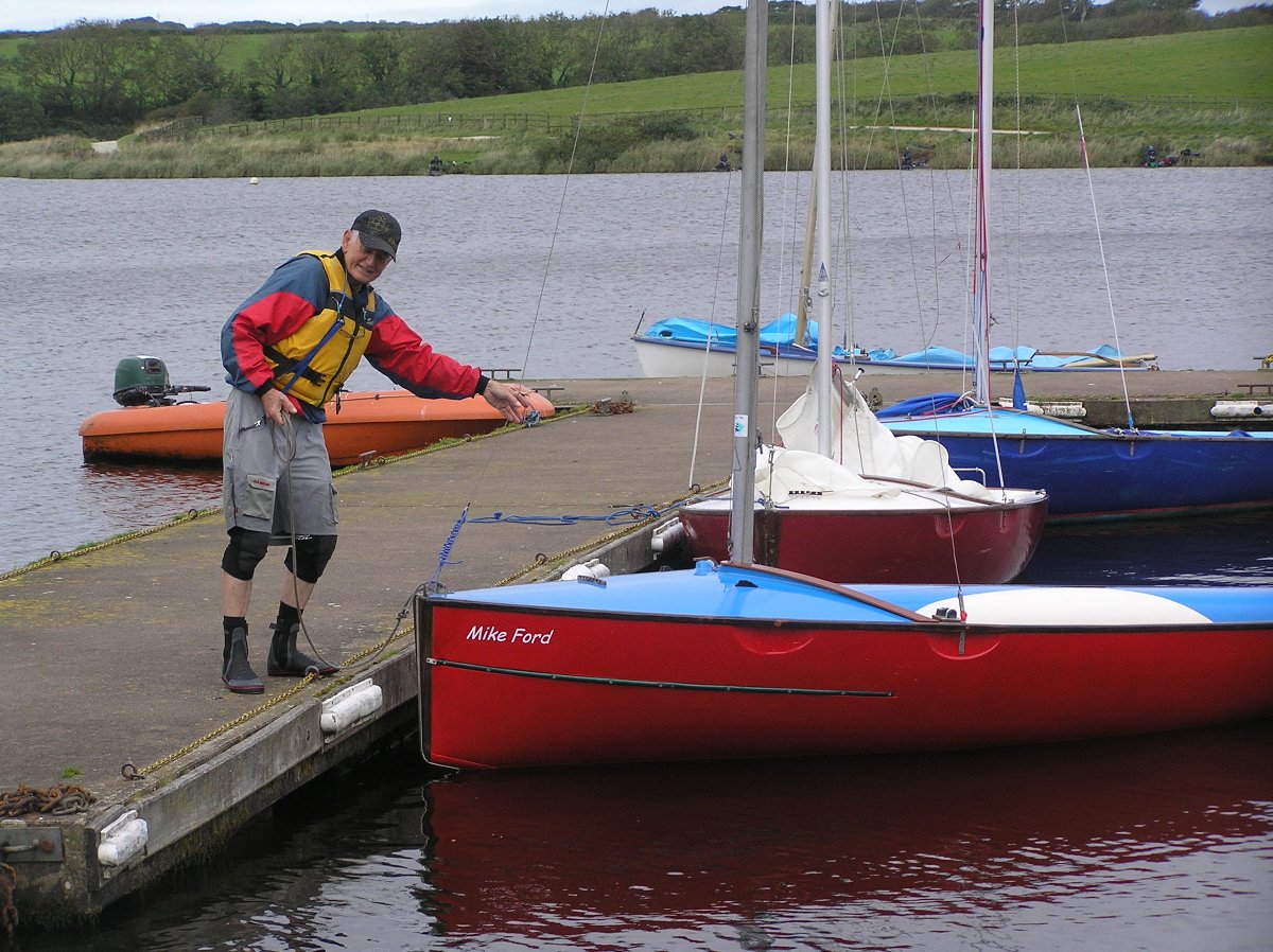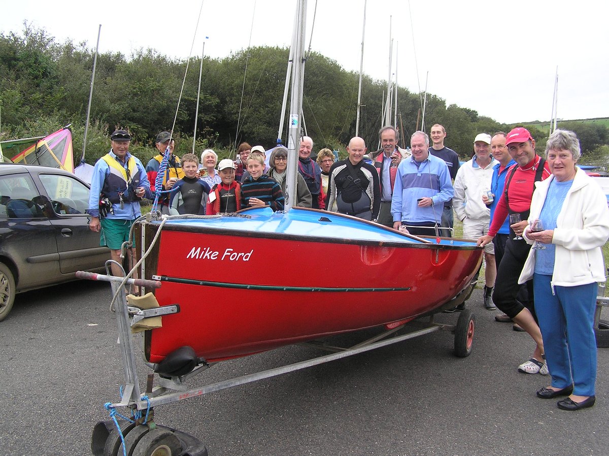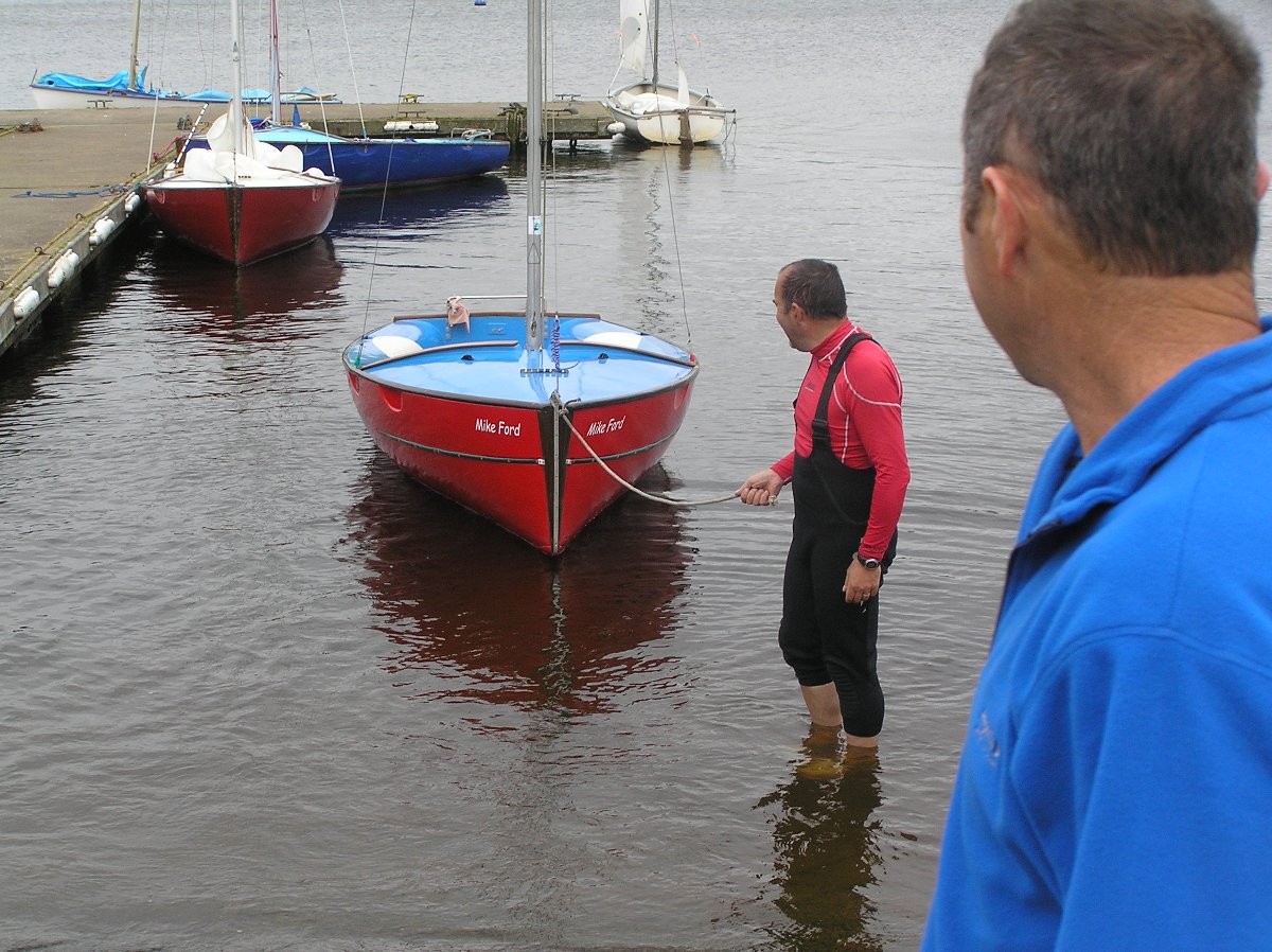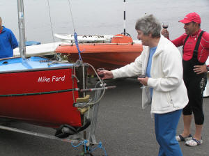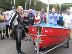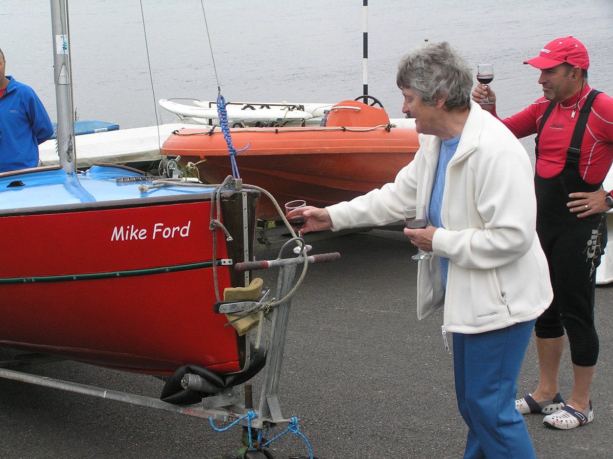A small ceremony was held at the lake on Sunday 16th September to mark the launch of the second club Bosun. The boat had been named the 'Mike Ford' to commemorate a much-missed member and former Commodore of the club. The boat, which had been immaculately restored following purchase as a near wreck after months of dedicated work by Roger Heasman, was resplendent in pristine eye-catching red, white and blue Jubilee colours paintwork. After a few well-chosen words from Simon Veal, the boat was ceremonially christened with a glass of port by Mike's widow, Mona Ford, watched by members of Mike's family and Ragna Eason, together with a sizeable number of club members; Mike's grandson, former club member Tim Kearse, was unable to be present for the ceremony due to work commitments but was able to see the Bosun at the pontoon later in the afternoon. Paul Whybrow then blessed the boat before its maiden launch. The Bosun was quickly into service, being used on the very next day for teaching an RYA Level 1 course being given Nicky Buckett and Roger Heasman.