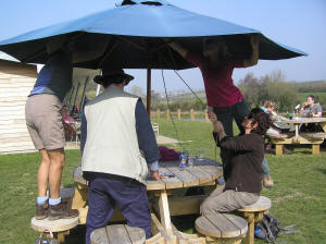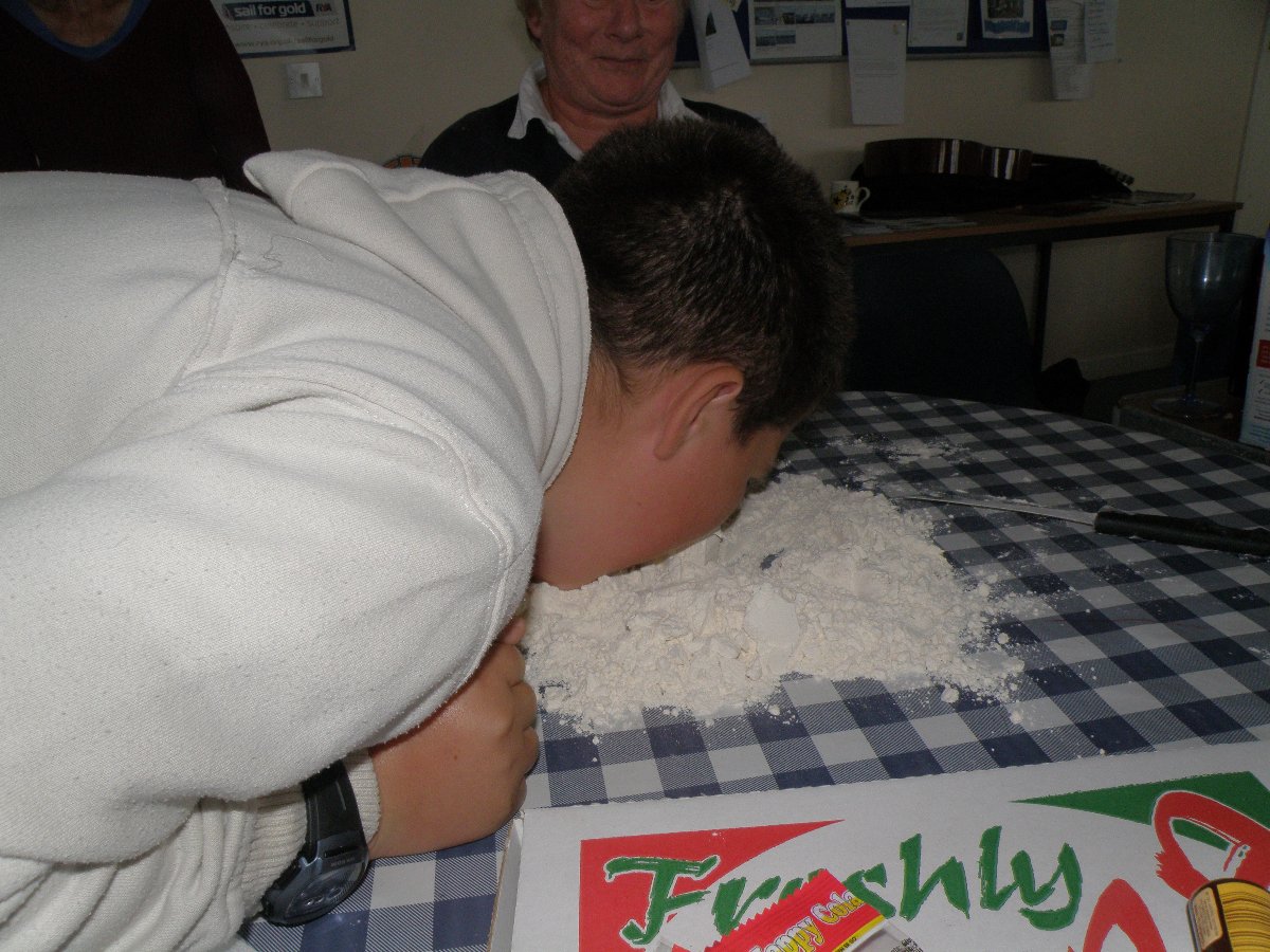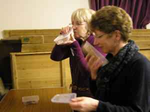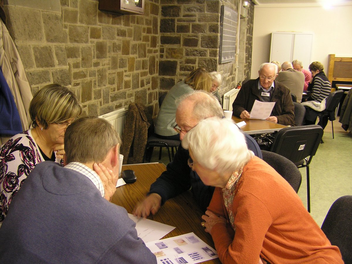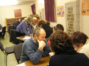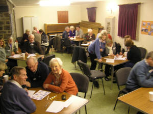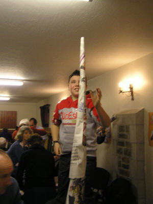 The 2012 start to the social programme was a Quiz Night, held at the Grenville Rooms in Kilkhampton. Attracting a big turnout which filled the skittle alley, Nicky Buckett had put together a packed and varied programme - so packed, in fact, that she only got through about half of the events she'd put together. The evening was certainly varied, ranging from traditional quiz segments, to identifying faces and bridges and even smells. Following on from last year's 'build a tower with marshmallows and spaghetti', this time the construction spot was 'build the highest self-supporting structure you can from a pile of newspaper and a metre of masking tape...'; the teams came up with a wide variety of approaches, none of which would have passed Building Regulations, but in the end the clear winner was James Pollard's group, with a tapering edifice that was so tall that it almost touched the ceiling. In all, a very enjoyable evening - thanks to Nicky for dreaming it all up.