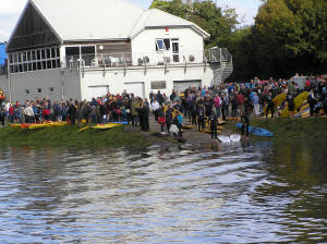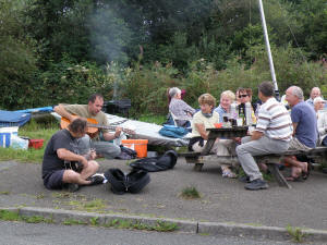 | .... and still comes up smiling..... | Good view of the start of the afternoon race on the Sunday | Two RS 200s in close contention: in front is Bob Sampson helming, with Nathan Pollard as crew and close behind Roger Heasman helming with James Pollard as crew | Simon Veal and Paul Clews in close hamony on guitar and ukelele; newly christened club barbecue smoking gently in the background |