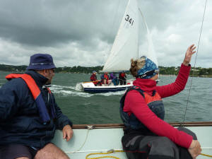 | If only they had an Olympic sport called 'Synchronised Sailing'...... | Christine Hartigan helming the Bass Boat, with a happy Everett Sharp and Kathy Wyke crewing, whilst John holds on to his hat.... (in case of people taking the pith, presumably) | Stephen Harrison at the helm of the Laser 16, whilst Roger looks totally chilled out.... | Rounding off a pretty good day; Simon leads the club in a toast to all the Olympic sailors |