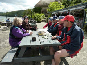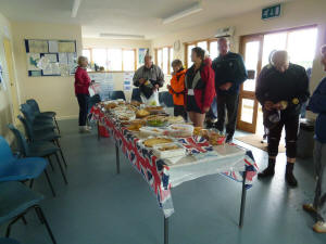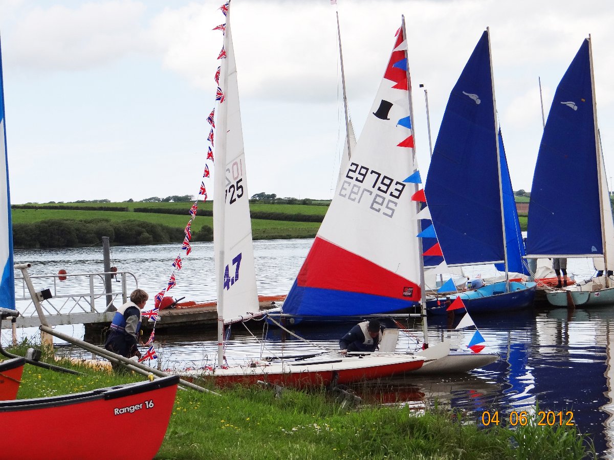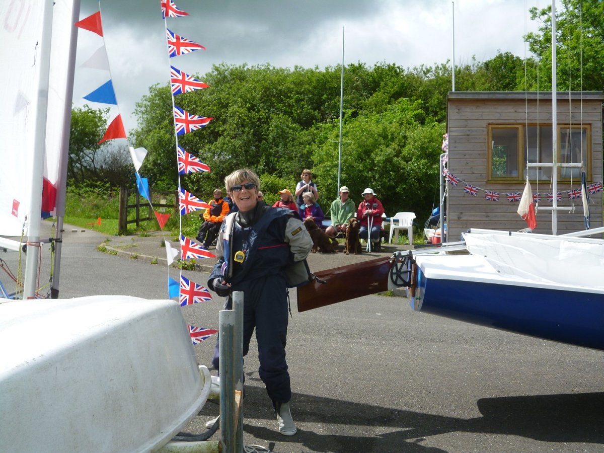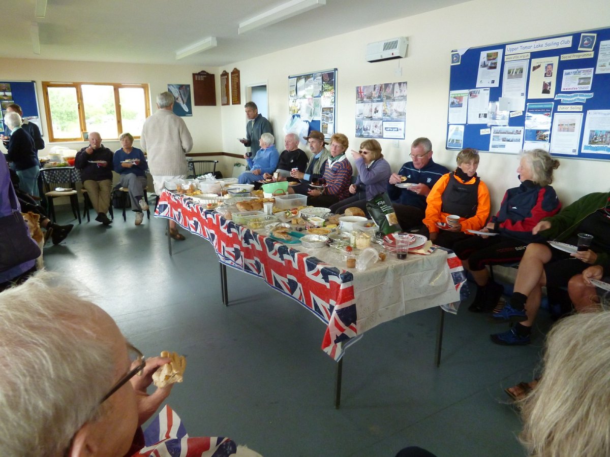 After a dismal Jubilee Sunday's racing when most competitors went home wetter than if they'd capsized, the Sailing Club's Big Jubilee Luch occasion turned out to be a much brighter affair. The Race Box was decorated in bunting, the Race Officer suitably attired, and the boats beautifully dressed for the day's racing event. The Lakes Trust had decorated the outside of the main building and the entranceway to the sailing area, which attracted many onlookers. The sun managed to come out and the two pre-lunch races were completed back to back in light airs, which suited almost everyone present. Then it was in the the Big Clubhouse for the Big Lunch, with the the room and tables dressed in red, white and blue. It was a great gathering with many of the Social Members coming together with the Racing Members to make it a lovely lunchtime social event. Then it was back on the water before more tea, cakes and prize giving.