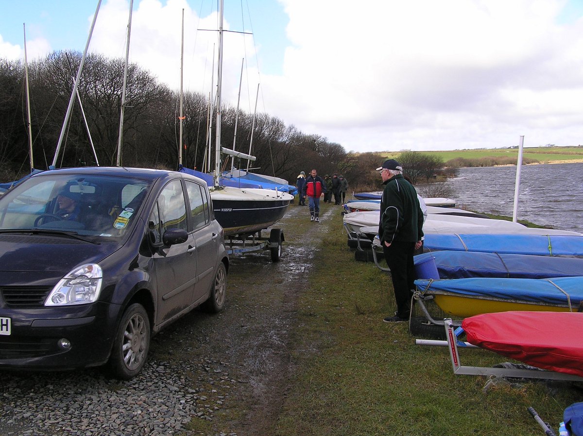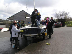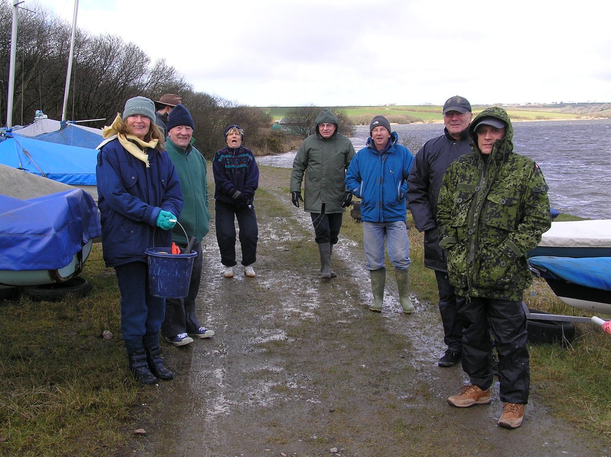 Sadly, the sailing season started with a whimper rather than a bang... A good crowd of people turned up for the traditional boat Scrub-Up in the morning, but it was so bitterly cold in the strong north-westerly wind that most people preferred to play 'Sardines' in the Race Hut, though a crowd did turn out to clean off the club's Laser 16, which after the last season spent out on a mooring, was badly in need of a clean. By the afternoon, the weather was even less enticing, with a good Force 5/6 wind with gusts probably 30+ mph sending white horse all down the lake and spray sluicing across the pontoon - sufficient to deter even the boldest sailors, so that everybody decided to defer getting out on the water to another week - a huge shame, particularly in view of the fact that several days recently have had mild sunny weather with a gentle breeze.... Let's hope that this isn't a bad omen for the season ahead; we could do without a repeat of the gusty weather last year that led to the cancellation of racing on quite a few Sundays. The photos below show some of the club putting on a brave face of it.....
