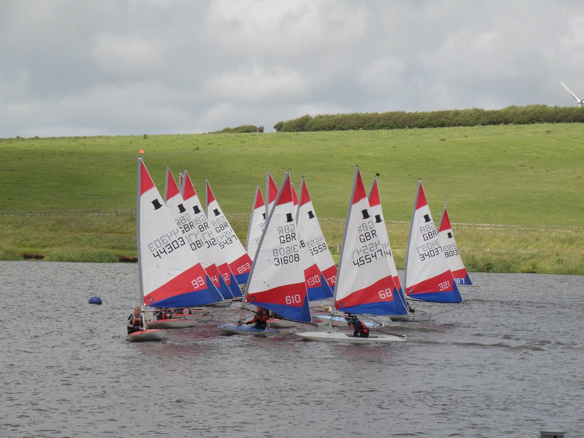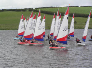 For the second year, the club hosted a Topper Weekend as part of the South West Regional Topper Traveller circuit. This year the event was held on the weekend of the 23rd/24th June, with Upper Tamar club members providing race officer, protest committee, beachmaster, safety boat etc - as well as the catering, where the bacon rolls were once again a hot favourite. Many thanks to everybody from the club who helped out - it was very much appreciated. Jane Anderson again bravely took part and went well, finishing up in a creditable 6th place. The pictures below show some of the racing on the Sunday, where the starts were hotly contested in all four races; many thanks to Mandy Pollard and Nicky Buckett for supplying the photos.